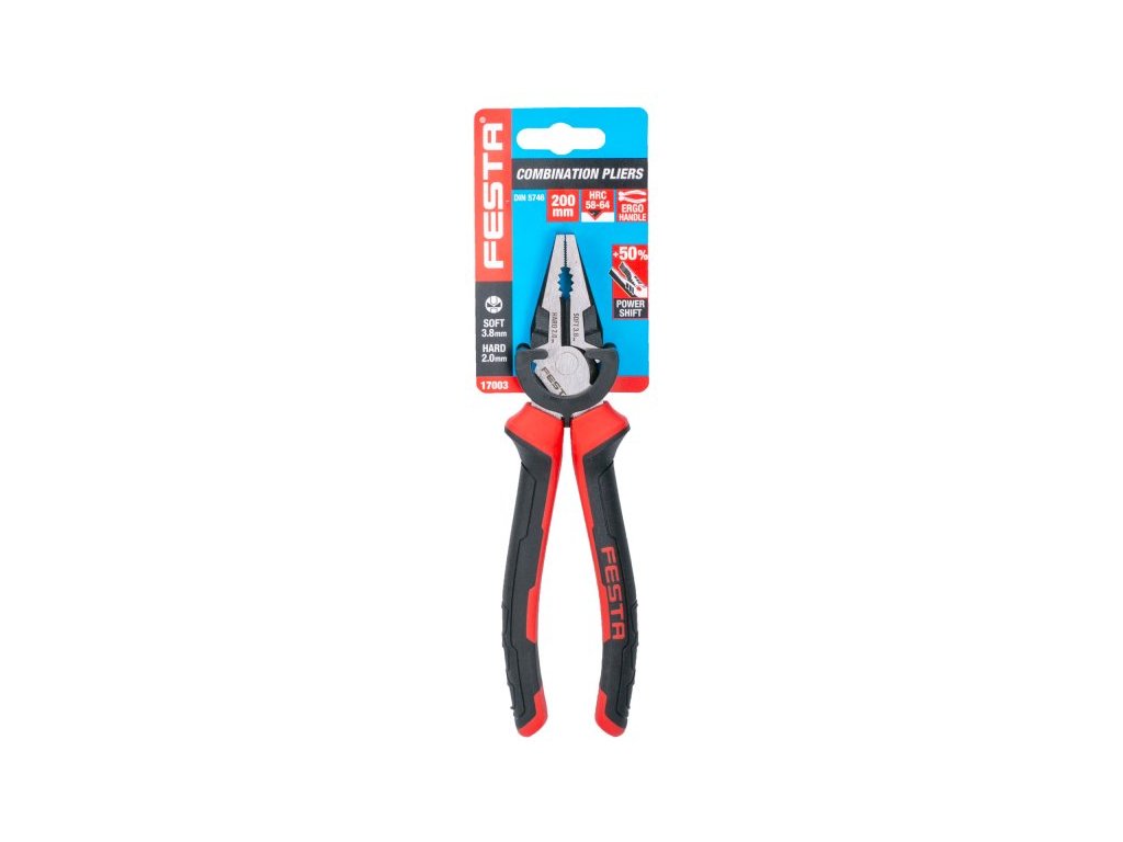 Vysoko kvalitné kliešte kombinované 200mm FESTA. Antikorózna úprava. Ergonomické dvojzložkové zmäkčené rukoväte. 30% väčší kontakt s rukoväťou znižuje potrebnú silu. Výrobca je certifikovaný podľa ISO 90001.